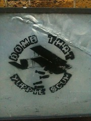 Unaccountably perhaps, when I first saw this Shoreditch grafitto I misread it as "Bomb that hippie scum". Which I took to be an expression of sympathy for much-maligned hippies. Instead, it's a tired anti-yuppy thing .... blah. Anyway, I liked the idea of it being an ironic attack on (ie praise for) hippies.